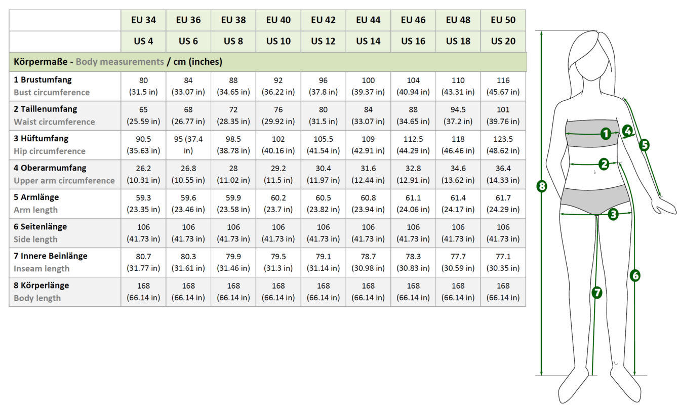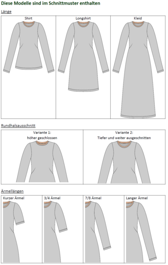 Es stehen dir vier Ärmellängen (Kurzarm, 3/4-Arm, 7/8-Arm, Langarm) und zwei Halsausschnittvarianten (hochgeschlossen oder weit & tief) zur Verfügung – für jede Jahreszeit die passende Version.