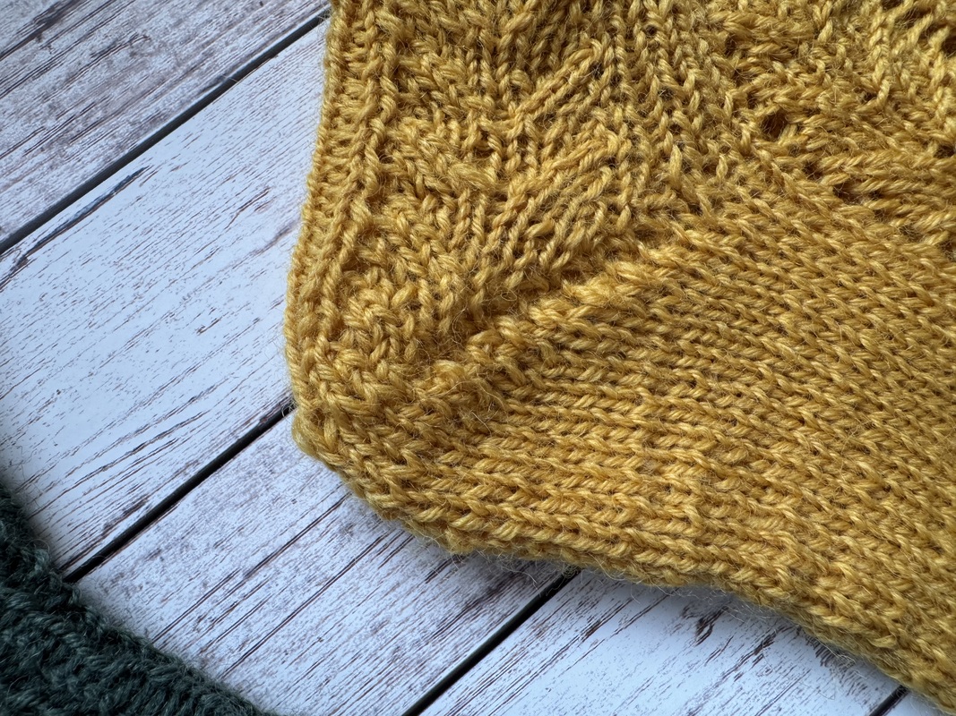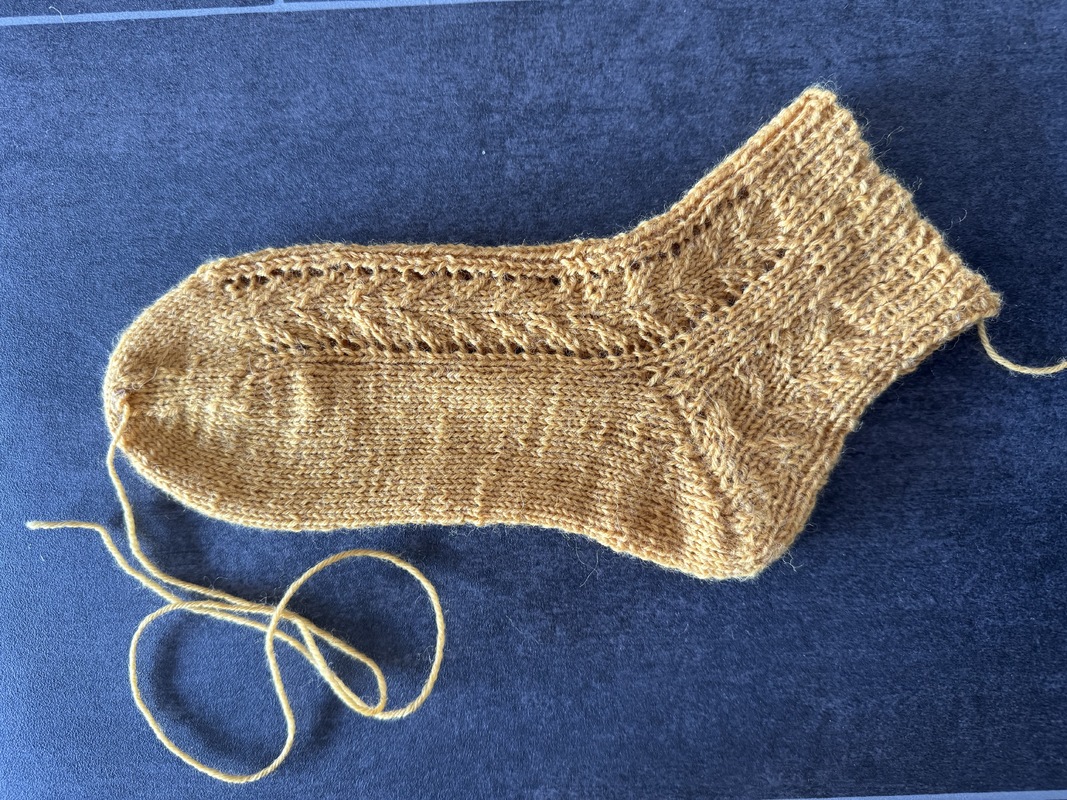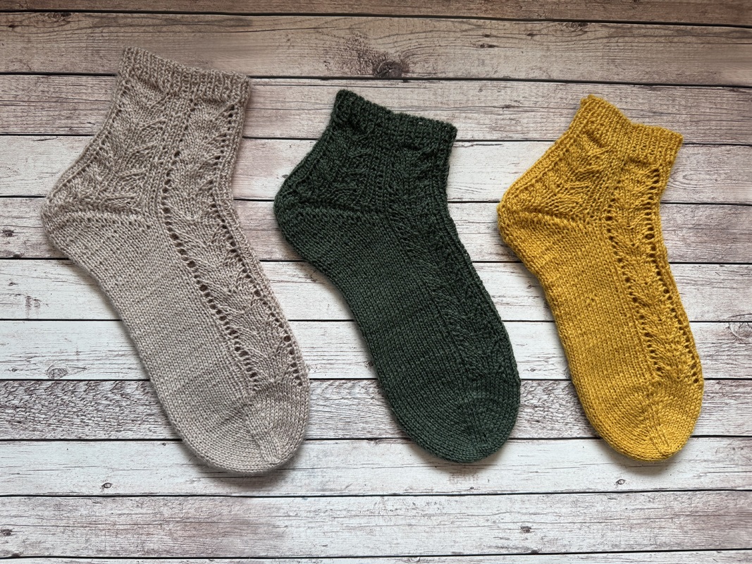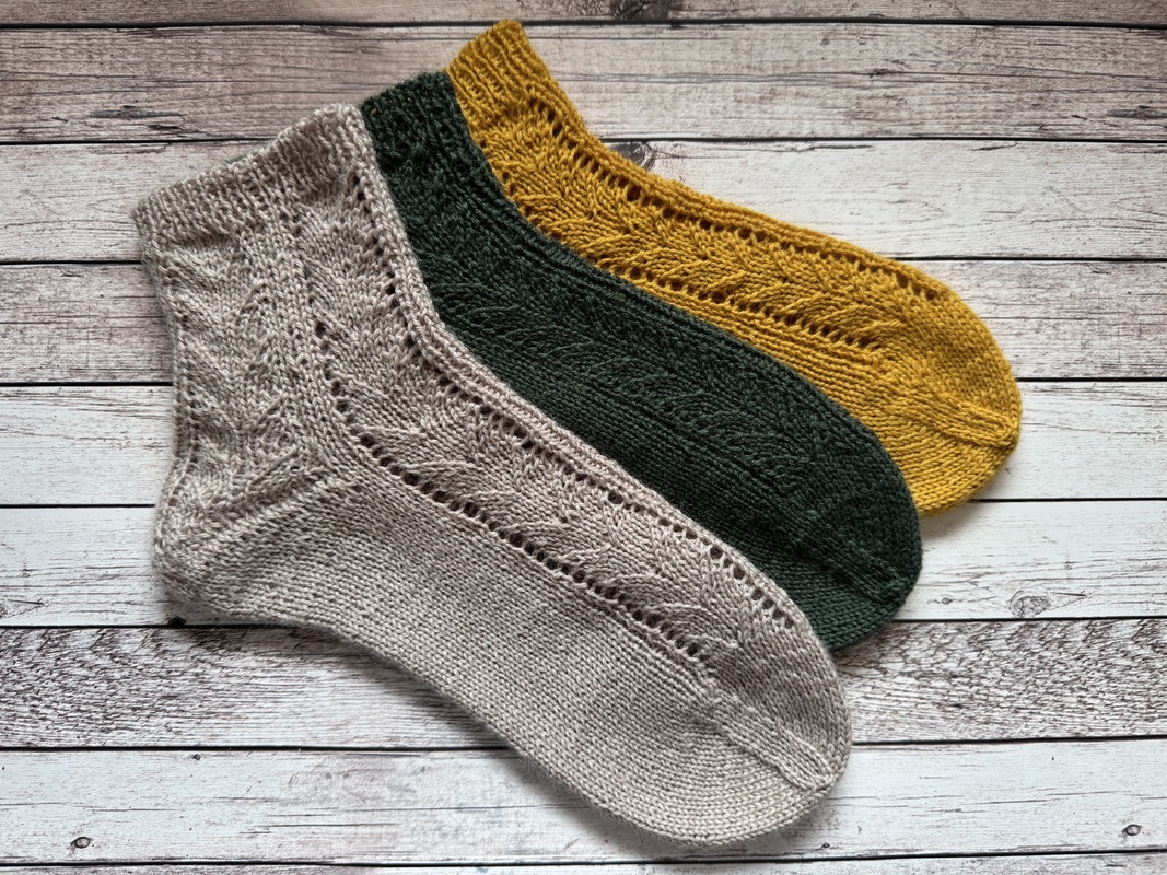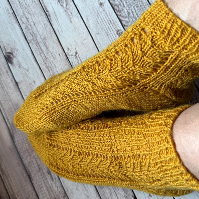 Bei der Anleitung handelt es sich um ein Sockendesign mit leichtem Lacemuster, einem elastischem Bündchen und einer Bändchenspitze. Das Muster zieht sich über die obere Hälfte der Ferse. Länge und Weiter der Socke kann individuell angepasst werden.
