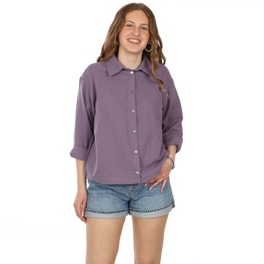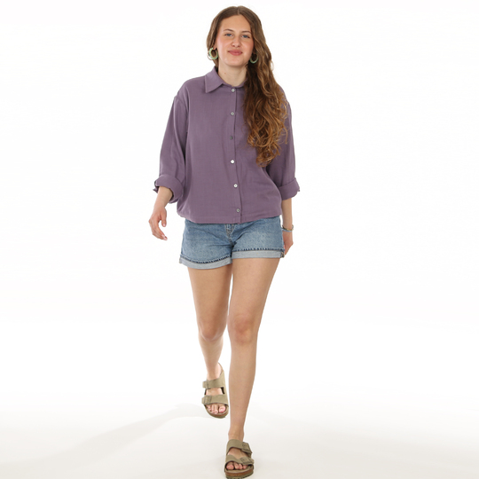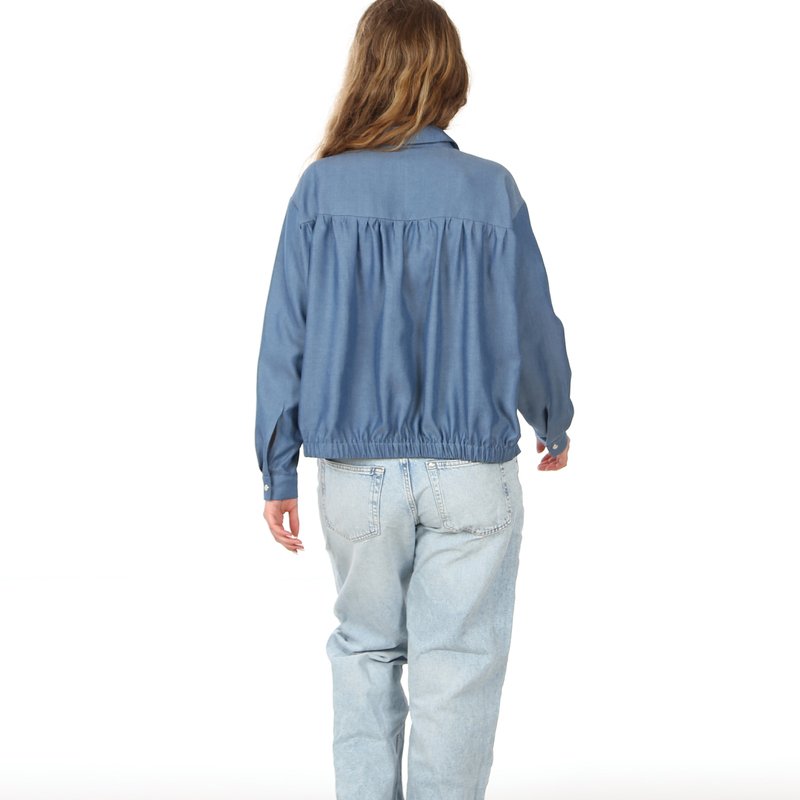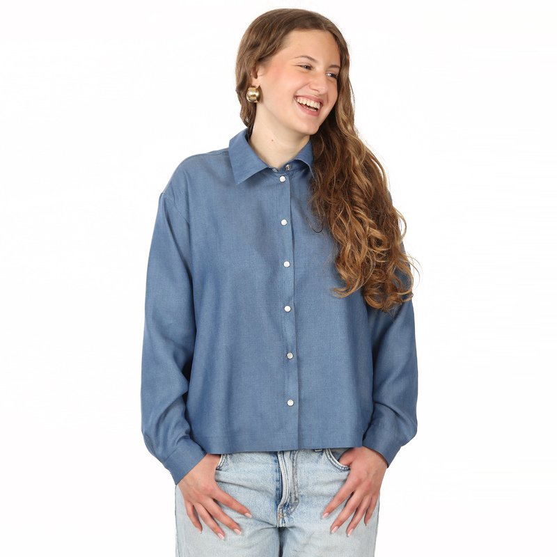 FRAU RUTH ist eine Bluse, die klassisch und gleichzeitig modern wirkt. Sie hat zahlreiche Details, die sie zu einem Projekt für alle machen, die gerne aufwendigere Schnittmuster nähen. Dazu gehören neben der Knopfleiste, einem Ärmel mit Manschetten und Schlitz, auch der Kragen mit Kragensteg und vor allem die breite Passe mit dem angesetzten, gekräuselten Rückenteil. Der gerade Saum wird im hinteren Teil durch ein Gummiband gerafft, was der Bluse eine besonders legere Optik verschafft.
