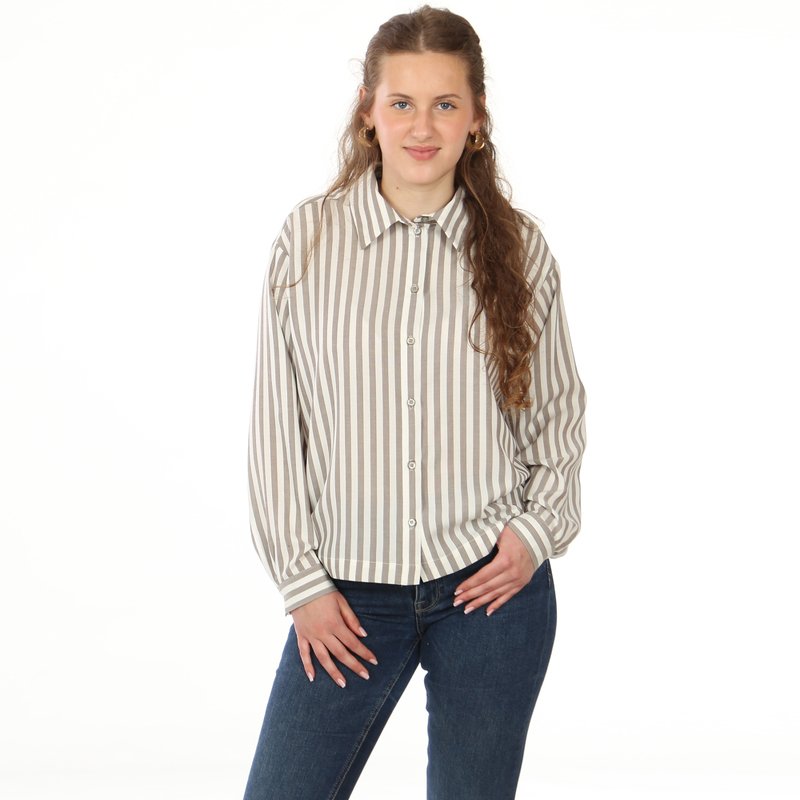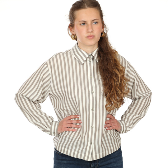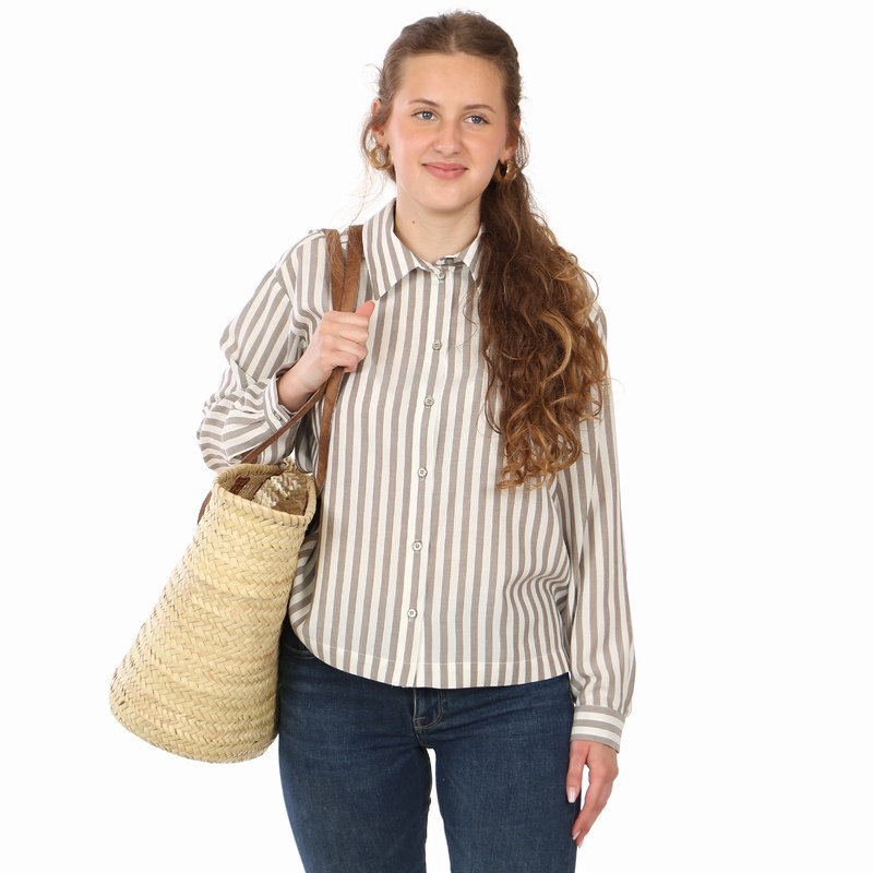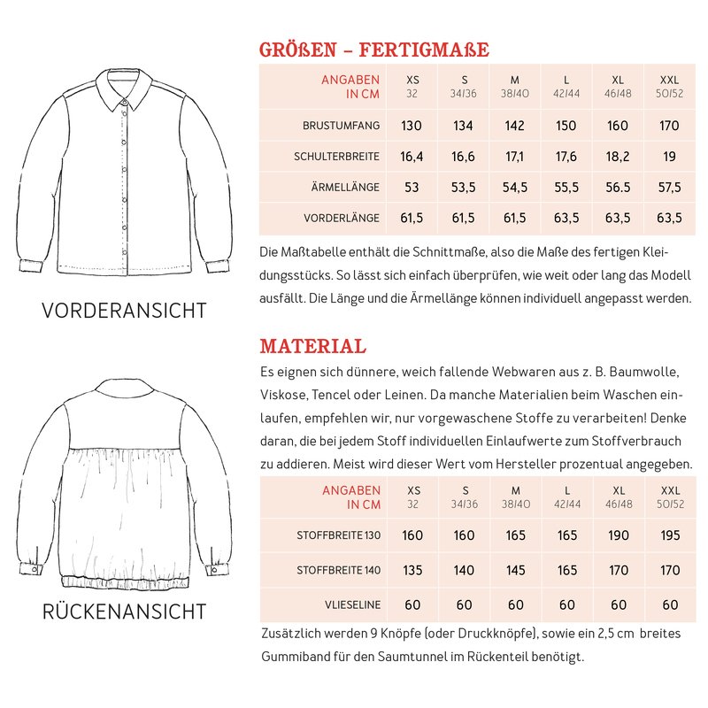Es eignen sich dünnere, weich fallende Webwaren aus z. B. Baumwolle, Viskose, Tencel oder Leinen. Zusätzlich werden 9 Knöpfe (oder Druckknöpfe), sowie ein 2,5 cm breites Gummiband für den Saumtunnel im Rückenteil benötigt.