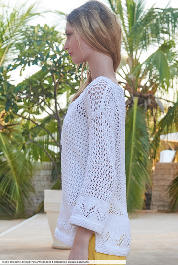 Weiße Pullis schaffen es immer wieder in unsere Sommergarderobe. Kein Wunder, denn sie lassen sich zu allen Farben problemlos kombinieren und bleiben länger als eine Saison aktuell. Hier ein Modell, das durch seine breite Zackenbordüre und durch transparente Netzstrukturen Blicke auf sich zieht. Dazu hohe Seitenschlitze und die Schnürung am Vorderteil, fertig ist ein weiteres Highlight für Job und Freizeit.