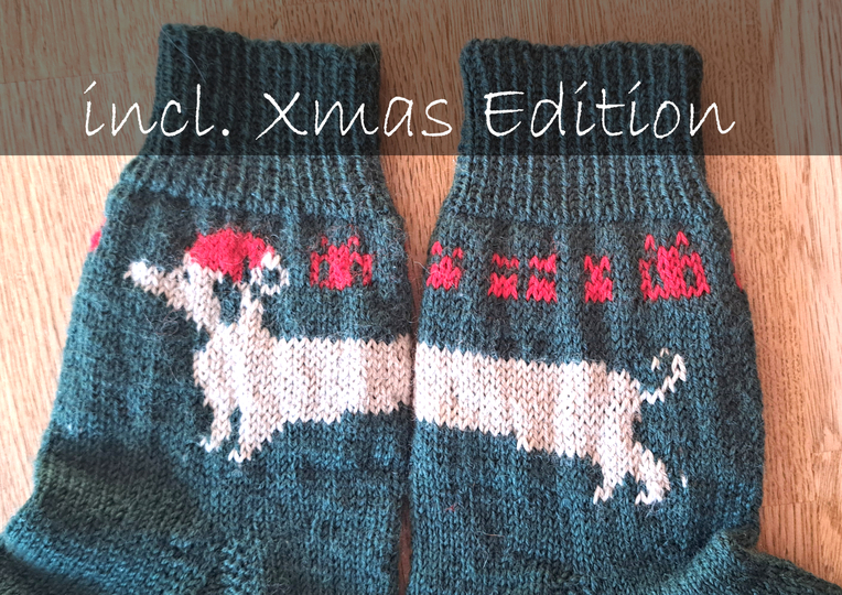Süße Dackel-Socken als digitalen PDF-Download (Strickanleitung) sowie Mustercharts. Inklusive Weihnachts-Edition: Dackel mit Weihnachtsmütze und Geschenken! Im Musterchart sind auch alle 5 Maschen Linien eingezogen um einfach mit der Ladderback-Technik zu stricken. Außerdem gibt es das Muster mit 80 Maschen und 64 Maschen, je nachdem wie du die Socke stricken magst.