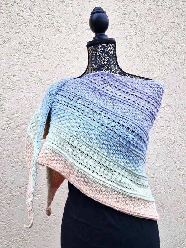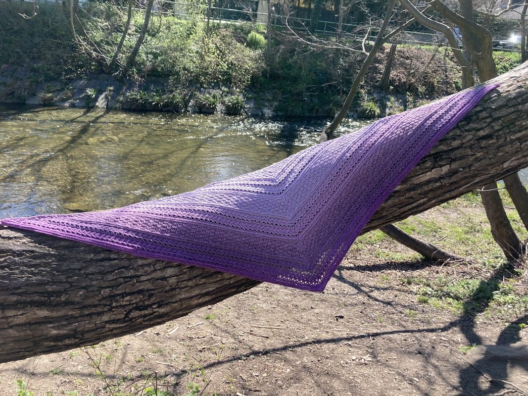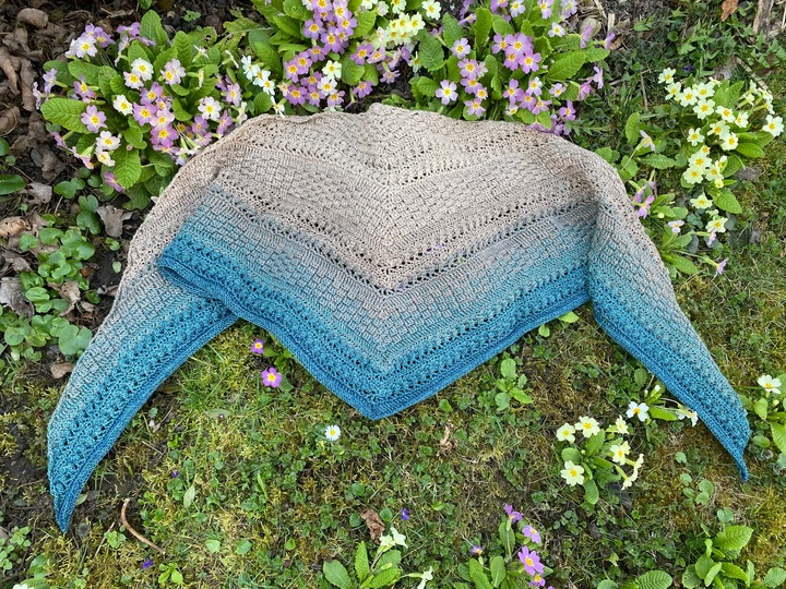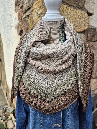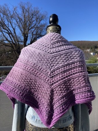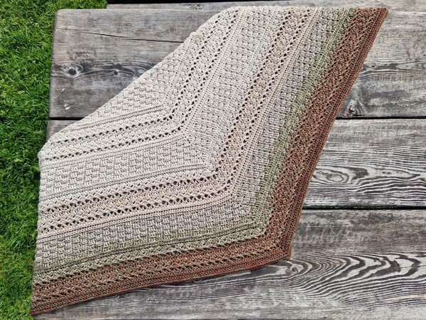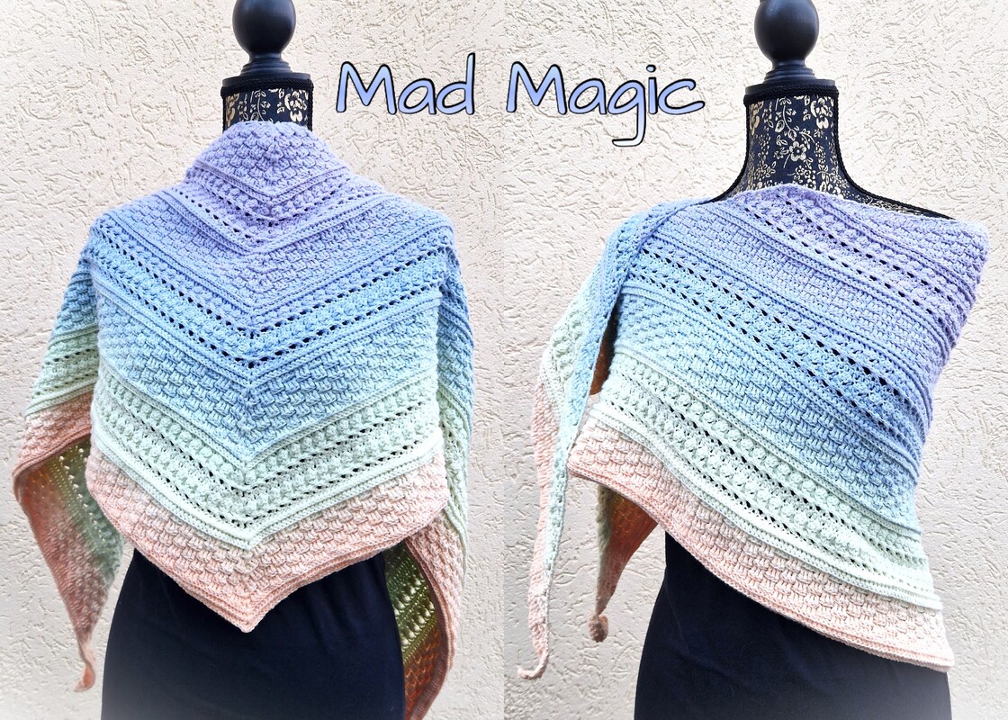 Mad Magic ist ein eher dichtes Dreieckstuch mit flacher Form (also nicht so tiefer Spitze). Wenn du dichte Muster magst und gerne Stäbchen und Reliefstäbchen häkelst, ist diese Anleitung für dich genau richtig .