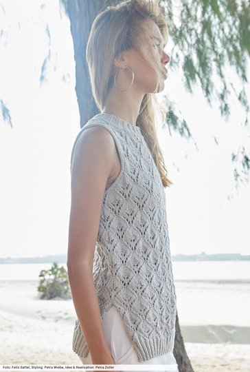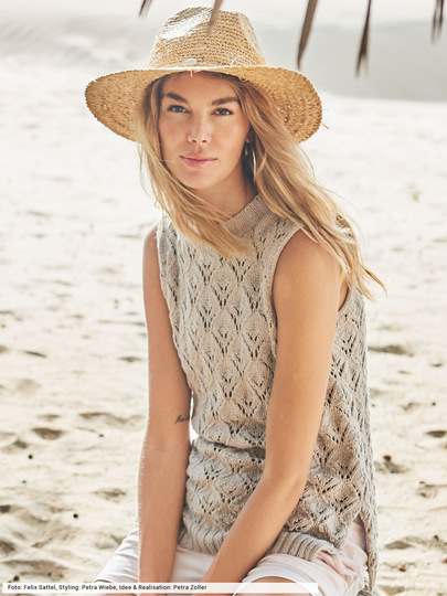 Halsnaher Kragen, schulterfreie Armausschnitte und hohe Seitenschlitze – allein die ausgetüftelte Schnittführung macht dieses Top zum Hingucker. Dazu das semitransparente Ajour-Rautenmuster, für das du in der Anleitung eine übersichtliche Strickschrift findest, und ein strapazierfähiges Baumwollgarn, das es in vielen unterschiedlichen Farbtönen gibt, – schon ist es fertig, das Lieblingsteil dieses Sommers.