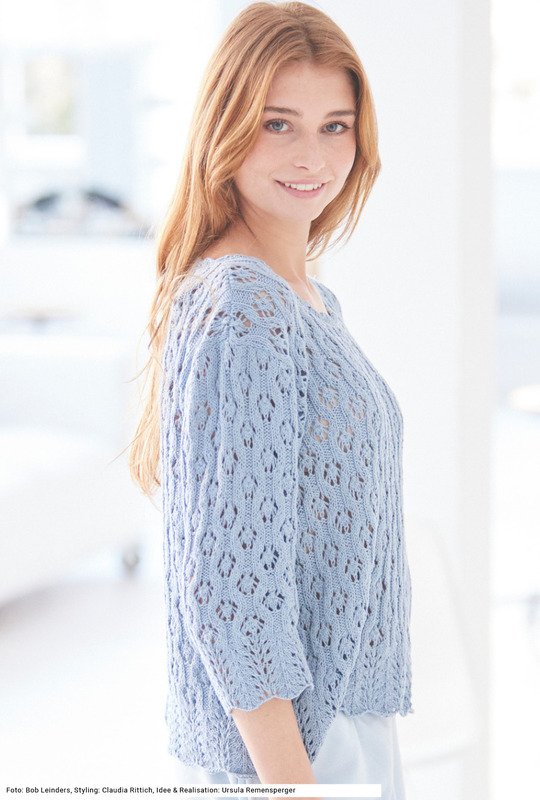 Ein romantisch anmutender Pullover mit dreiviertellangen Ärmeln passt zu jedem Look – nicht nur zu einem eleganten langen Rock, sondern auch zur Jeans; er ist ein perfekter Allrounder. Es gibt zwei unterschiedliche Lochmuster: ein einfaches an den Saumrändern von Vorder-, Rückenteil und Ärmeln und ein blumiges allover. Außerdem sorgt die geschwungene Häkelborte am Halsausschnitt für das gewisse Extra. Das Garn besteht aus Pflanzenfasern: Baumwolle, Lyocell (aus Cellulose hergestellt) und Leinen. Die Anleitung dazu gibt es für die Größen 36/38, 40/42 und 44/46.