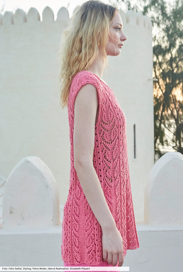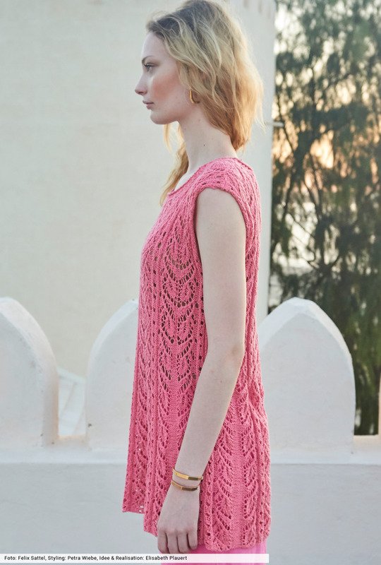Die schmeichelnde A-Form dieses Tops entsteht durch Maschen, die innerhalb der Glatt-links-Flächen zusammengestrickt werden. Dies ist in unserer Anleitung genau beschrieben und auch für die Ajourmuster-Streifen gibt es eine übersichtliche Strickschrift. Das sommerliche Garn besteht aus Baumwolle, die mit Fasern aus Viskose und Leinen angereichert wurde – eine tolle Kombination, die weichen Tragekomfort garantiert.