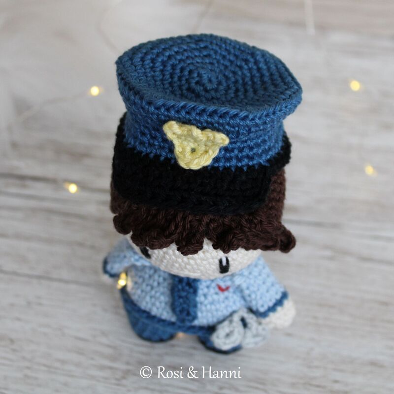 "Polizist Jo" wird bei angegebener Wolle und Häkelnadel ca. 12,5 cm groß (mit Mütze).