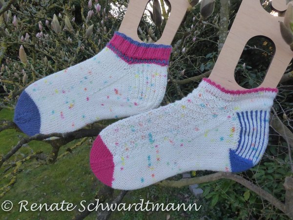 Die PDF Datei enthält die Anleitungen für die beiden oben beschriebenen Sneakersocken für die Größen 36/37, 38/39 und 40/41.