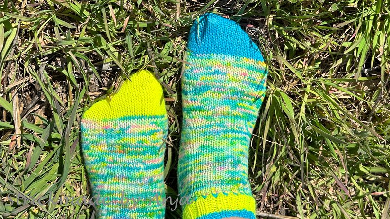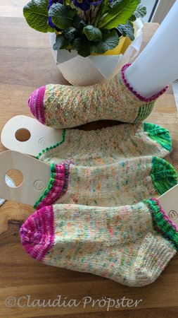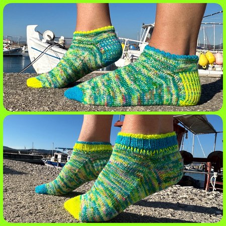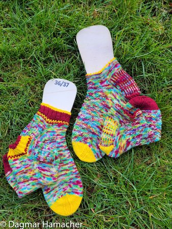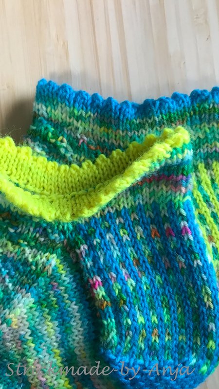 Aus einem farbenfrohen Strang Sockenwolle von @emilieshandgewerkeltes sowie 2x 20g Minis sind diese beiden wunderschönen Sneakersocken entstanden: