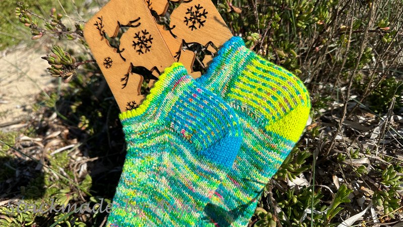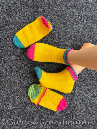 In dieser Anleitung sind die gezeigten Bündchen, die verstärkte Hufeisenferse und die einfache sowie auch ergonomische Bandspitze beschrieben. Es kann aber beliebig ausgetauscht werden.