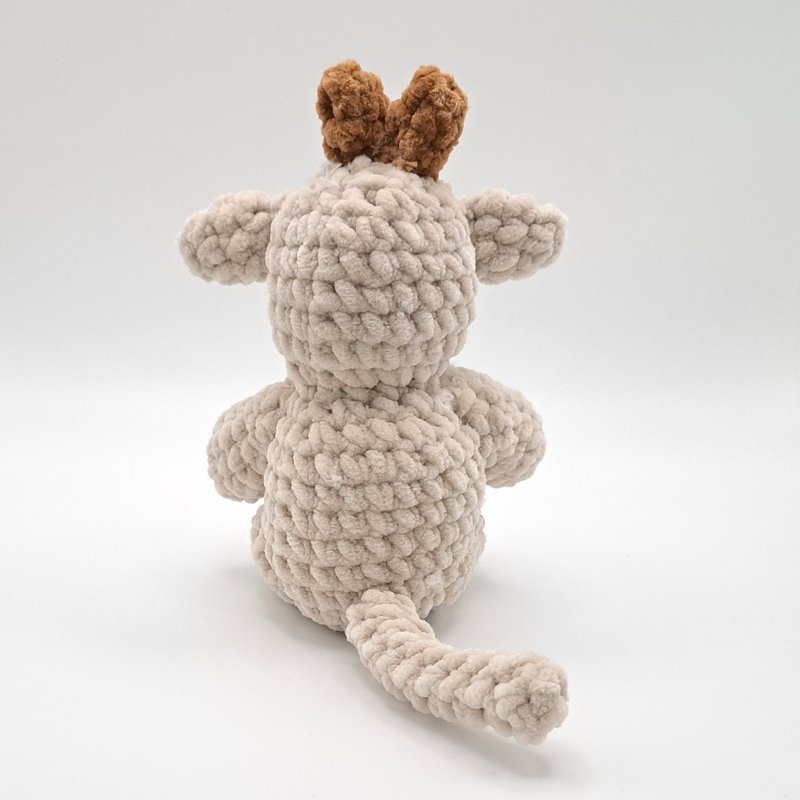 Mit einem Chunky Chenille Garn (100g / 120m) und einer Häkelnadel Nr. 4,5 wird die Kuh ca. 18 cm hoch.