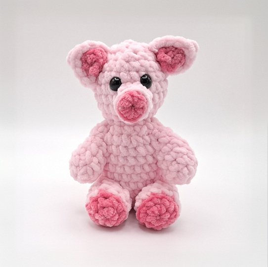 Mit einem Chunky Chenille Garn (100g / 120m) und einer Häkelnadel Nr. 4,5 wird das Schwein ca. 19 cm hoch.