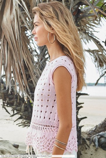 Bei diesem Top kannst du schon zu Beginn deine Kunstfertigkeit unter Beweis stellen, da die Spitzenborte nach unserer übersichtlichen Strickschrift zuerst quer gearbeitet wird. Dann nimmst du an der geraden Kante Maschen auf und strickst in einem einfachen Lochmuster weiter. Zum Schluss blden gehäkelte Krebsmaschen das Finish und lassen ein sommerliches Oberteil entstehen, mit dem du nicht nur am Strand Aufmerksamkeit erregen wirst.