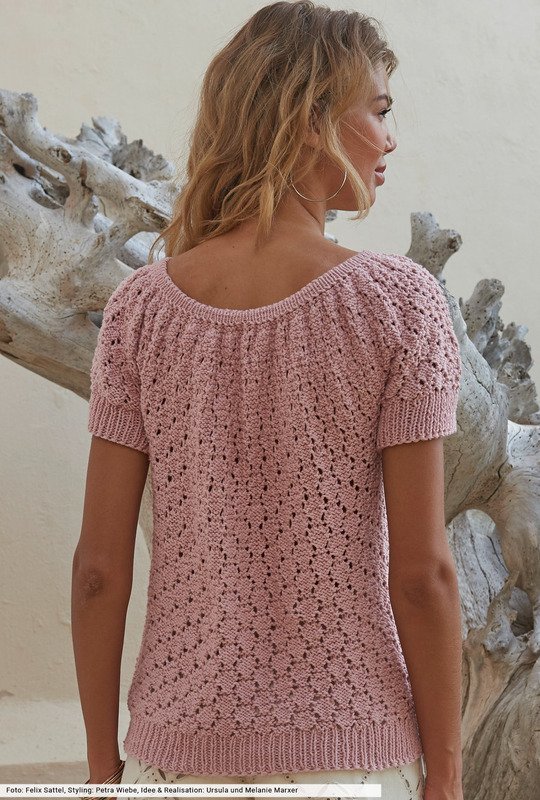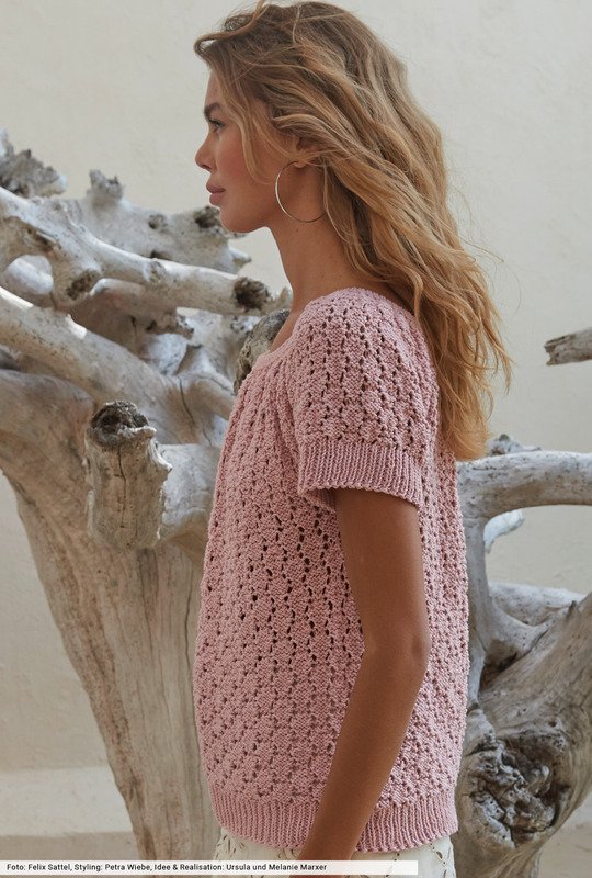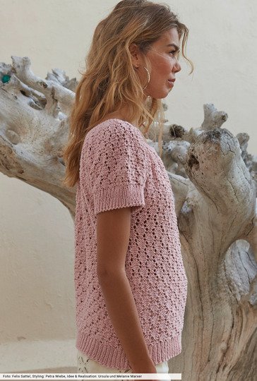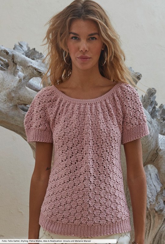 Erst stricken, dann zusammennähen? Nein, nur stricken! Denn dieser aparte Kurzarmpulli wird vom Bund bis zur Halsblende in Runden gearbeitet. So kann man sich voll und ganz auf das hübsche Ajourmuster konzentrieren, für das wir in unserer Anleitung eine Strickschrift angefertigt haben. Hochwertige Baumwolle in zartem Nude-Ton unterstreicht die dezent-elegante Wirkung und lässt dich gut durch die heißen Tage kommen.
