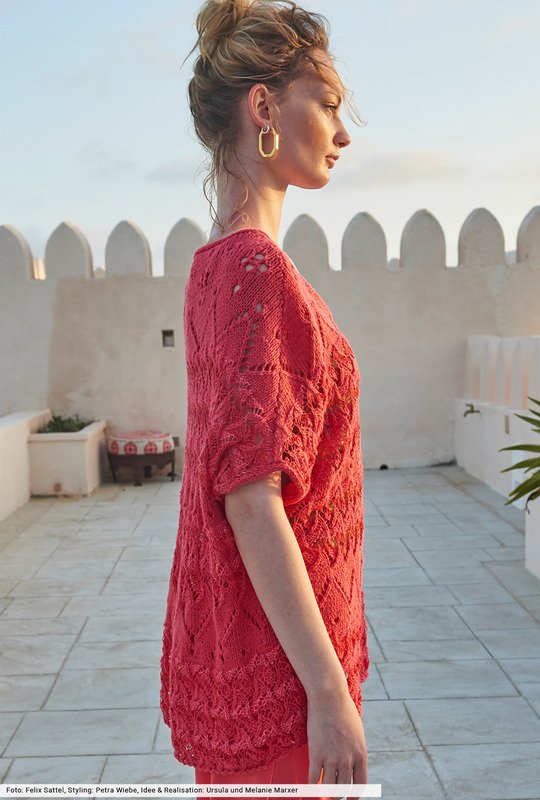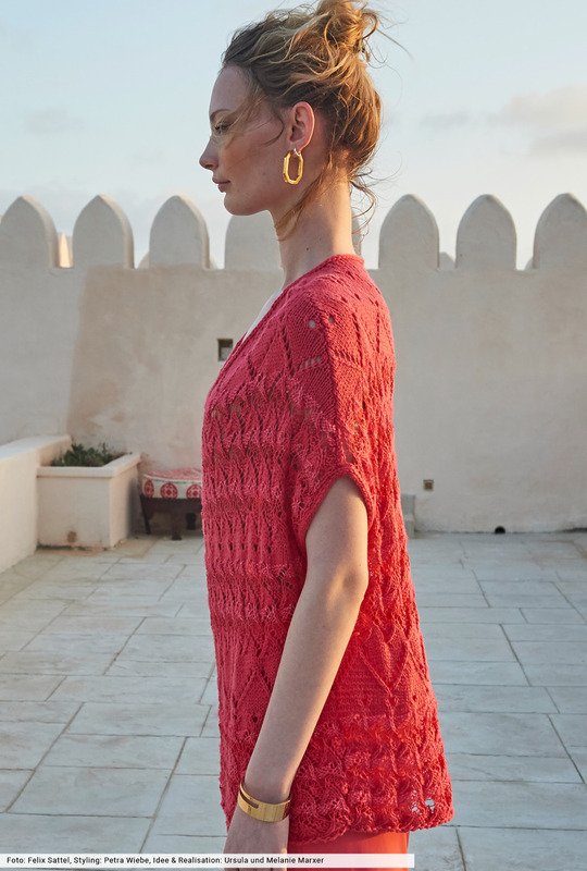 Ein sommerliches Highlight auf der ganzen Linie: Bei diesem Pulli kommen nicht nur drei verschiedene Garne zum Einsatz, die wir alle in Koralletönen präsentieren – einer Trendfarbe, die jeder Frau gut zu Gesicht steht. Auch verschiedene Loch- und Ajourmuster setzen sich gekonnt in Szene. Dafür haben wir in unserer Anleitung jeweils eine Strickschrift erstellt, mit deren Hilfe du dich orientieren kannst.