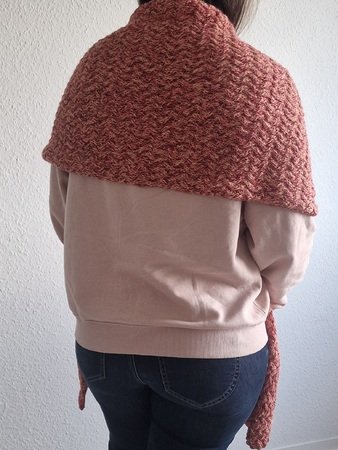 Ich habe ihn aus einem 5 fädigen Bobbel (gefachtes Farbverlaufsgarn) mit 1350m Lauflänge und ca. 500g Gewicht gearbeitet. Er ist 180cm lang und ca. 43cm breit.