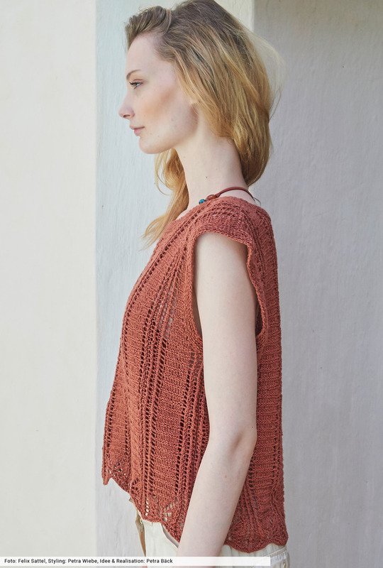 Wir fangen hier mit dem etwas schwierigeren Part an, nämlich der Ajourborte. Die strickst du nach einer übersichtlichen Strickschrift, die du bei der Anleitung findest. Danach geht's easy weiter mit Querrippen und Lochreihen. Dann noch alle Ränder mit Kraus-rechts-Blenden ausstatten, fertig ist ein Sommertop aus coolem Baumwoll-Leinengarn, das dir länger als eine Saison Freude bereiten wird.