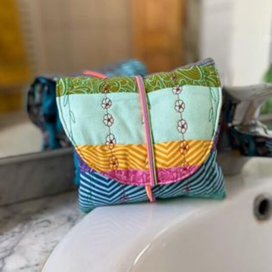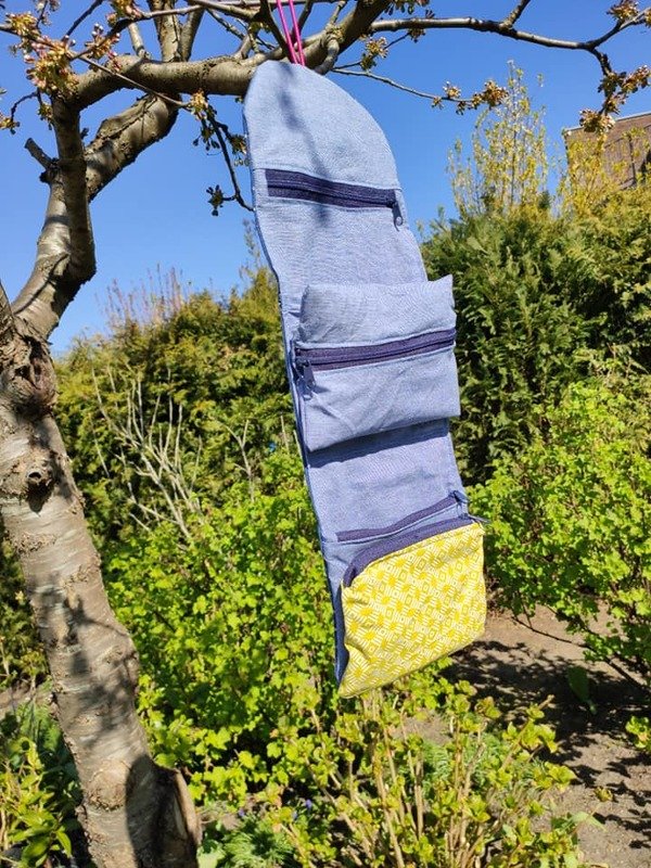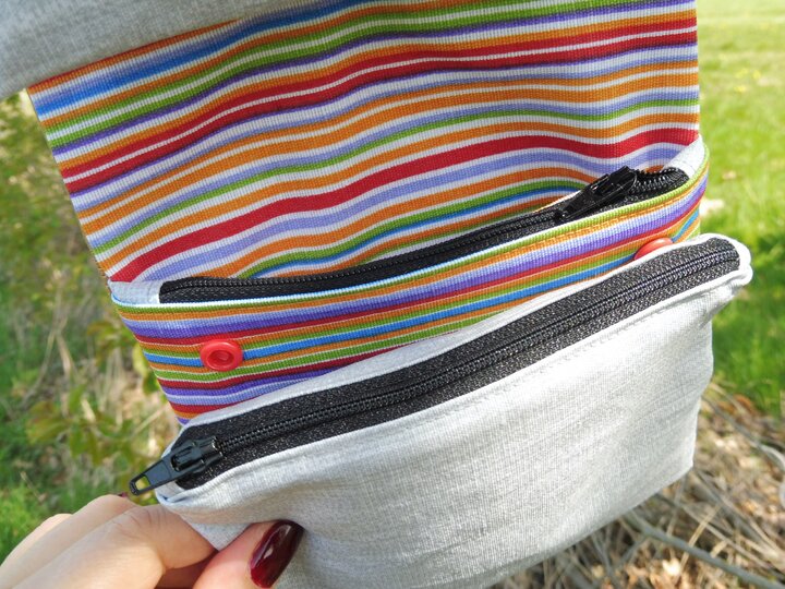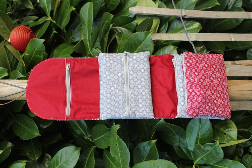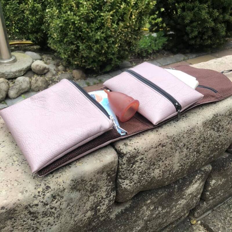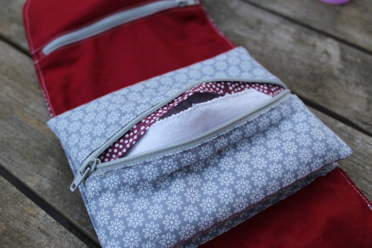 So gibt es ein Fach für die Menstruationstasse, getrennte Fächer für saubere und verschmutzte Wäsche bzw. (selbstgenähte) Binden und ein Fach für Feuchttücher. Die Wetbag für die Schmutzwäsche lässt sich abknöpfen, sodass sie direkt mit in die Waschmaschine kann, ohne dass die gesamte Tasche gewaschen werden muss.