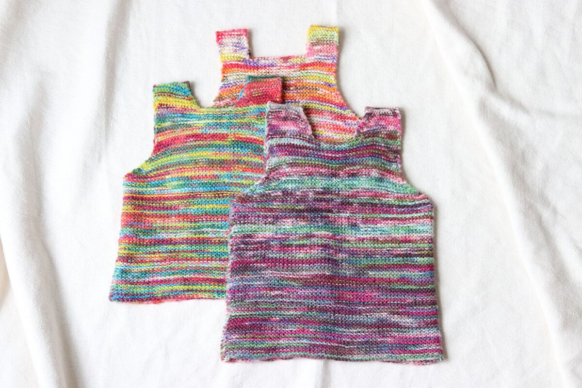 Durch Abnahmen entstehen zunächst die Armausschnitte, gefolgt vom Halsausschnitt. Zuerst wird der erste Träger gestrickt, dann der zweite. Anschließend werden beide Träger mit aufgeschlungenen Maschen verbunden. Dank dieser Konstruktion entfällt auch eine Schulternaht. Zum Schluss werden die Seiten zusammengenäht – und der Slipover ist fertig!