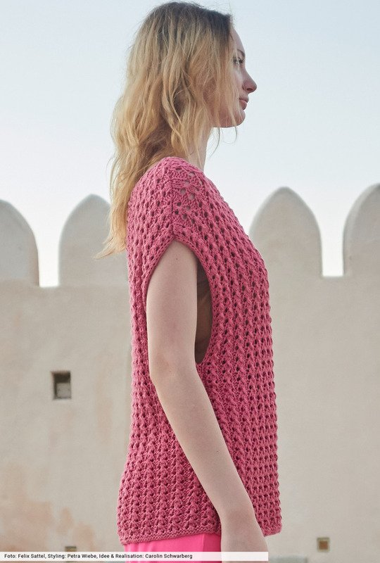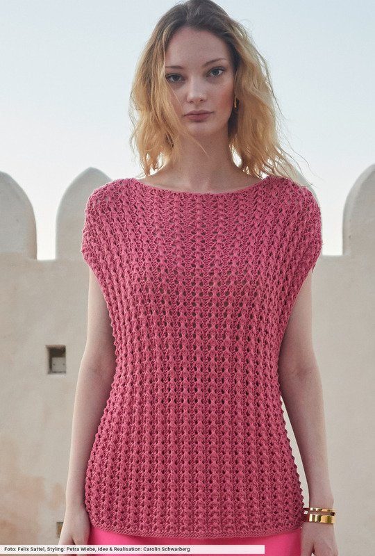 Wer etwas schlichtere Muster-Optiken bevorzugt, liegt mit diesem Top genau richtig. Das sanft schimmernde Viskosebändchen lässt die Strukturen des einfachen Lochmusters toll zur Geltung kommen und sorgt für die weich-fallende Silhouette. Der saubere Kante an den Armausschnitten entsteht durch doppelte Randmaschen, die in der Anleitung genau beschrieben werden. Hohe Schulterschrägungen und der gerade Halsausschnitt sorgen für die perfekte, aber lässige Form.