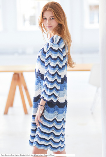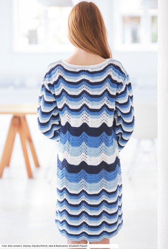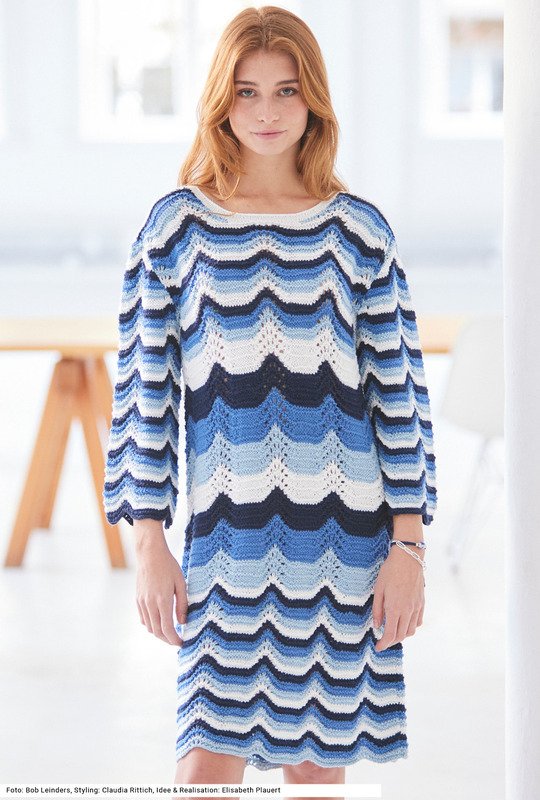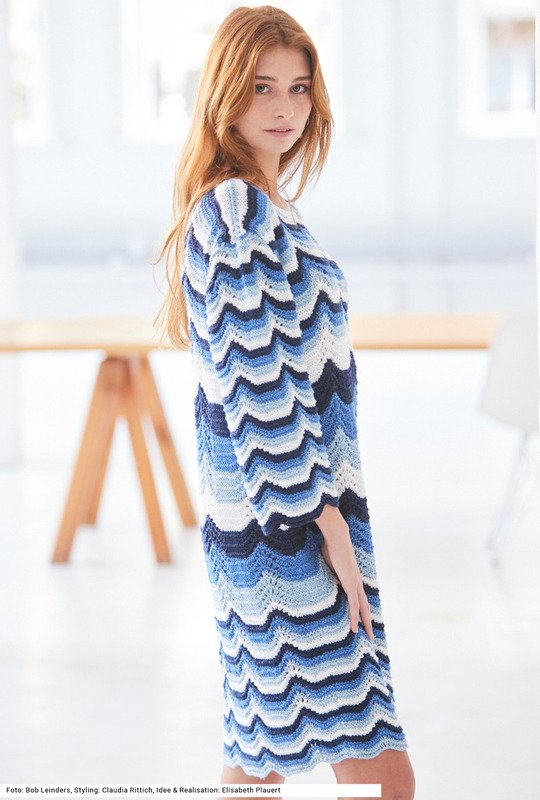 Ein welliges Pfauenmuster ist nicht nur einfach zu stricken, es bekommt noch mehr Dynamik durch verschieden breite Farbreihen – so wie bei diesem leicht taillierten Kleid. Dessen Länge ist so gewählt, dass sie die Knie umspielt. Die Ärmel haben eine Armkugel, sodass sie sich gut in den Armausschnitt einpassen. Der runde Halsausschnitt wird am Schluss mit ein paar Runden glatt rechts eingefasst. Als Garn haben wir ein dezent glänzendes Garn aus Viskose, Baumwolle, Leinen und Polyamid gewählt. Die Anleitung steht für die Größen 38/40 und 46/48 zur Verfügung.