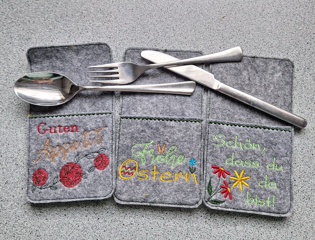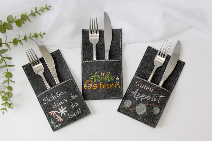 Die wunderschönen Bestecktaschen könnt ihr schon ab dem 10x10cm Stickrahmen fertigen und sind in zwei Größen enthalten.