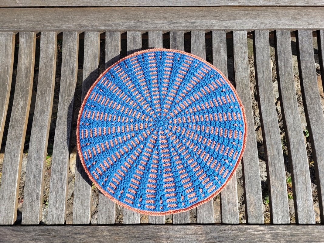 Im Garten, auf der Terrasse oder der Parkbank. Zweifarbig gehäkelt im sogenannten Mosaikmuster, das sehr viele
