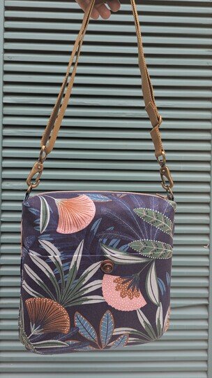 Die Tasche ist als Umhängetasche konzipiert und wird mit einem verstellbaren Schulterriemen genäht.