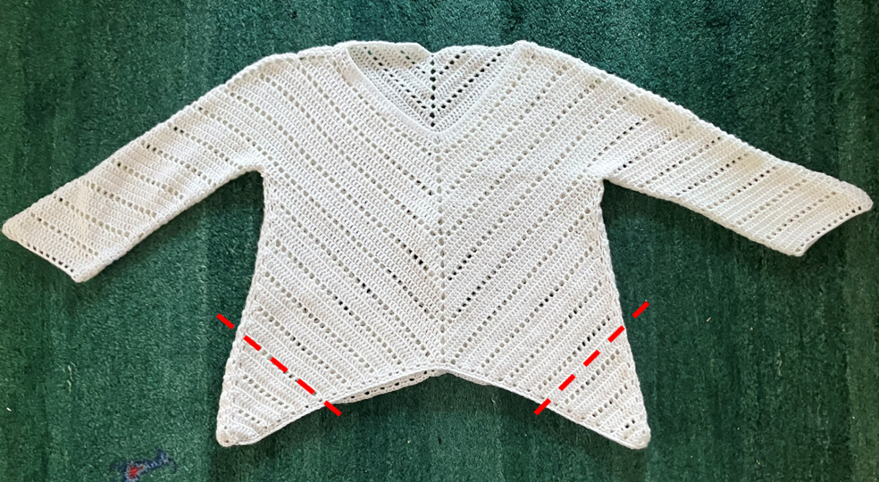 Dieser Pulli besticht durch seine besondere Form. Er endet in der Mitte ungefähr auf der Höhe des Gürtels und hat links und rechts „Flügel“. Durch die Form, die sich nach unten hin weitet ist er ein absoluter Figurschmeichler, die ich in meinen Anleitungen ja gerne „Bauchwegschummler“ nenne. Wenn dir die Flügel zu lang sind, kannst du sie auch stutzen. Ich zeige, wie das geht.