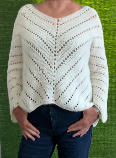 Du kannst den Pulli in allen Größen häkeln. Man beginnt ja oben wie beim RVO und arbeitet sich langsam in einem Stück nach unten, sodass man jederzeit probieren kann, ob er schon gut über den Busen passt. So ist die richtige Passform garantiert.