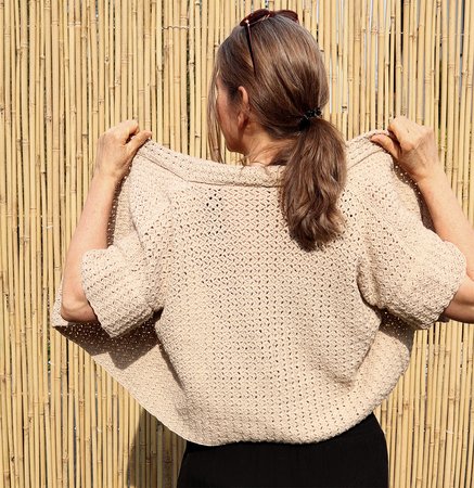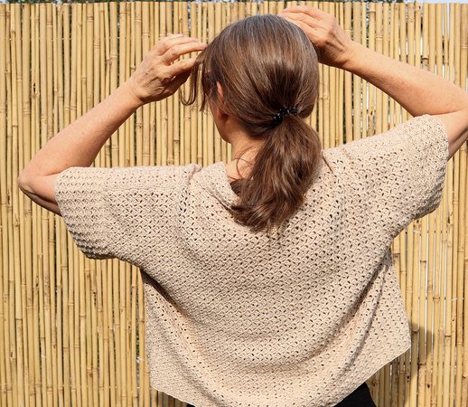 Dieses ansprechende dezente Muster setzt sich aus Lm, festen Maschen und Stäbchen zusammen. Da fast ausschließlich unter Luftmaschen-Bögen gearbeitet wird, ist das Häkeln sehr entspannt, augenschonend und fernsehtauglich. Der Schnitt ist einfach und klassich, die Kragenlösung raffiniert. Ein schönes Basisteil, toll kombinierbar für viele Gelegenheiten.