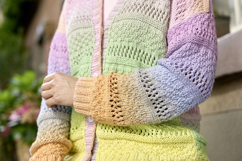 Dieser farbenfrohe Cardigan mit Mustermix wird aus der 1-2-3 Ideen in der Farbe 34 gestrickt und besticht durch seinen lebendigen Farbverlauf in frischen Sommertönen. Der raffinierte Mustermix kombiniert verschiedene Stricktechniken und sorgt für eine spannende Struktur und Optik. Die lockere Passform macht ihn zum vielseitigen Begleiter – perfekt für entspannte Sommertage. Die Anleitung ist leicht verständlich und eignet sich sowohl für Anfänger als auch für erfahrene Strickerinnen. Holen Sie sich mit diesem Cardigan einen sommerlichen Hingucker in Ihre Garderobe!