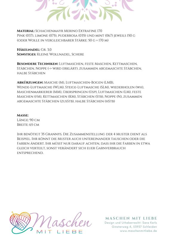 Diese Anleitung enthält zu allen 4 Grannys eine ausführliche Beschreibung mit Bildern und der passenden Häkelschrift. Darüber hinaus gibt es auch für die Bordüre Häkelschrift und Text, sowie passende Bilder.