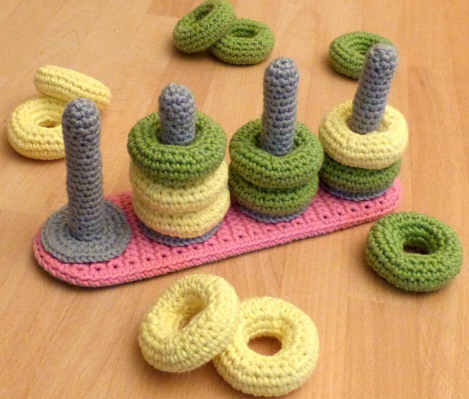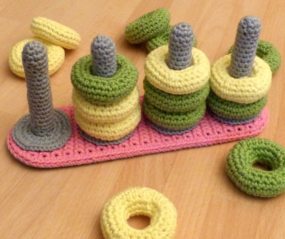 Bei Verwendung von Baumwollgarn mit einer Lauflänge von ca. 90m/50g und Nadelstärke 3,5 wird das Spielbrett etwa 25 cm lang und 10 cm hoch, die Ringe bekommen einen Durchmesser von 6 cm.