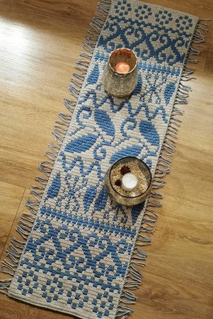 Für den Tischläufer habe ich ein Baumwoll/Acrylgarn verwendet. Häkelnadel Nr. 4.