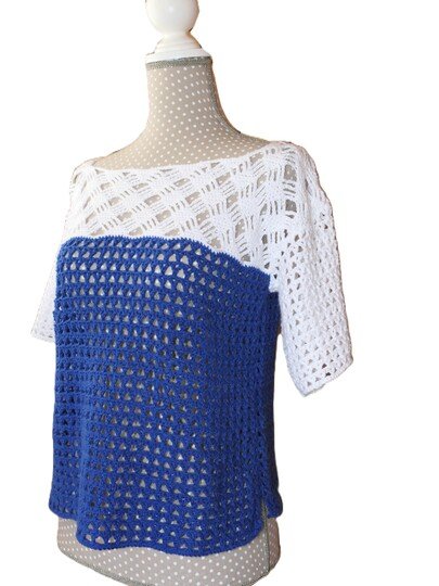 Ob lässig zur Jeans oder schick kombiniert - dieses Shirt besticht durch sein außergewöhnliches Design. Der untere Teil ist in tiefem Blau gehalten und zeigt ein luftiges Muster in Kelchform. Das Oberteil bildet einen stilvollen Kontrast in reinweißem Karomuster. Es verleiht dem Shirt eine zeitlose Frische. Ob für dich selbst gehäkelt oder als liebevoll gehäkeltes Geschenk - dieses Shirt verbindet Kreativität mit Tragbarkeit.