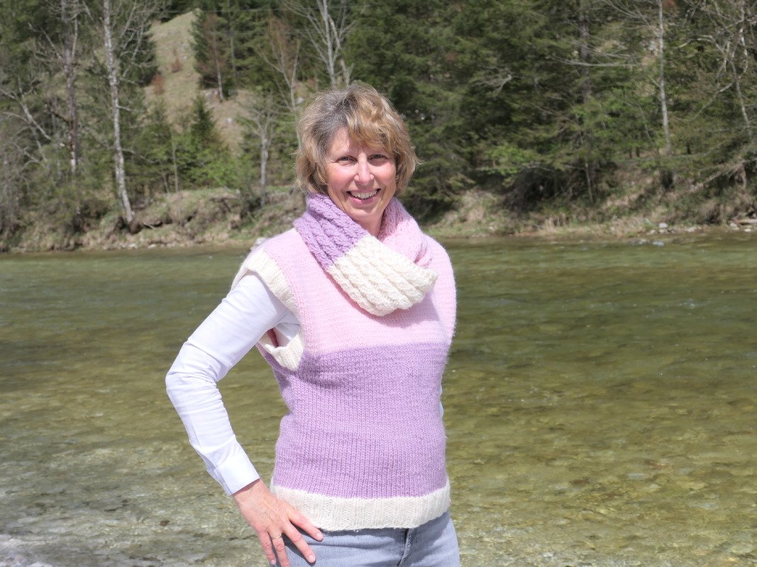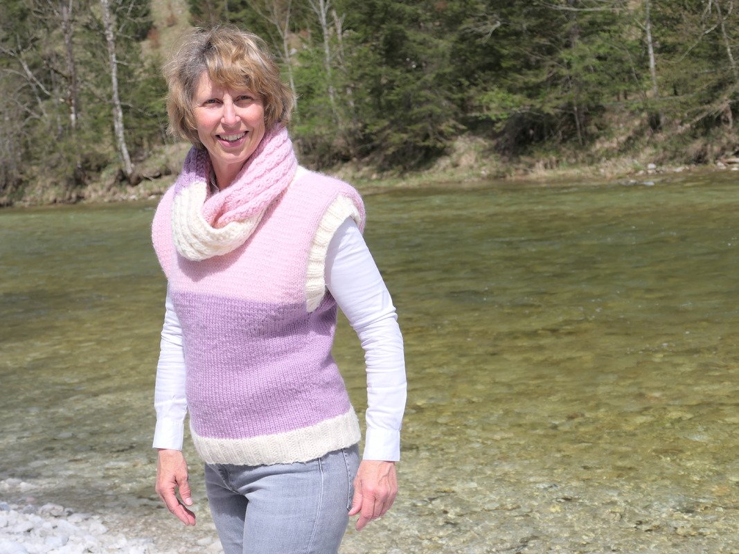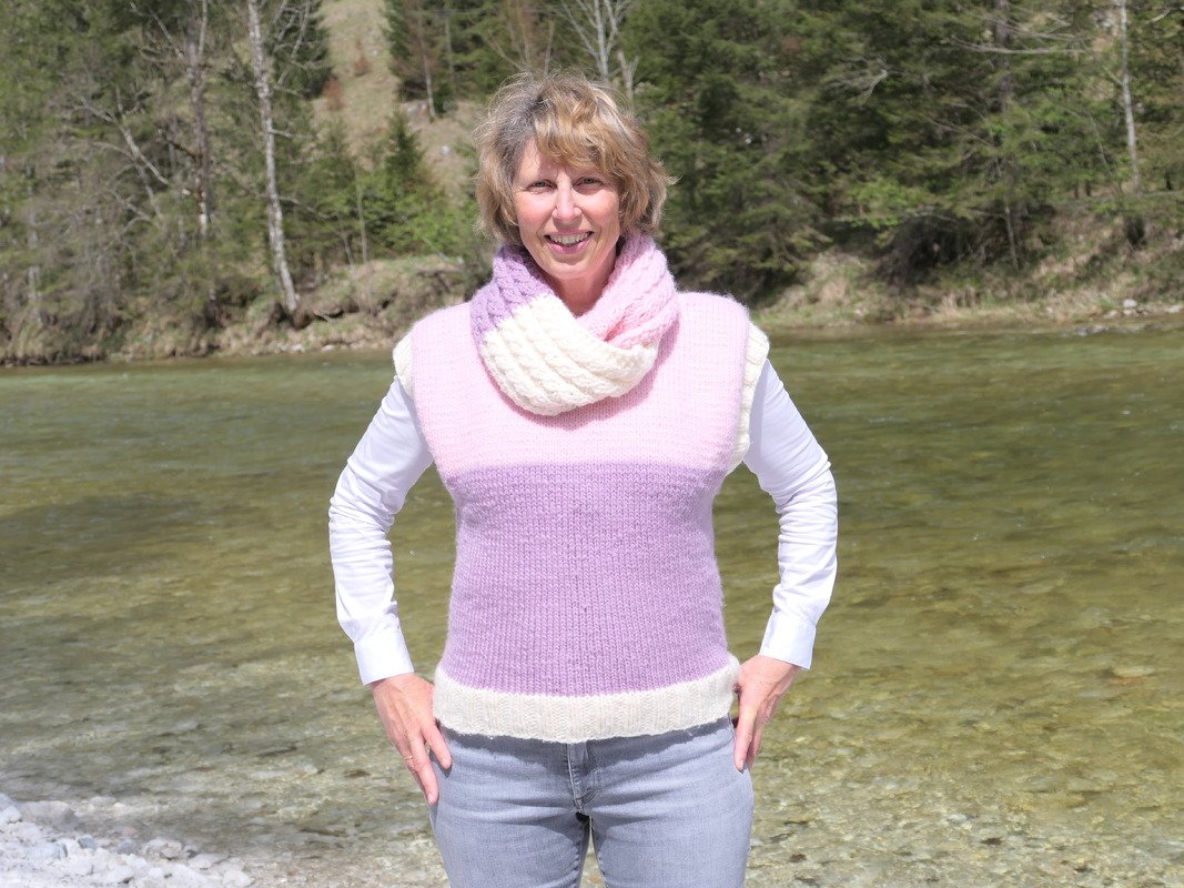 Loopschal und Pullunder werden mit der gleichen Wolle gestrickt.