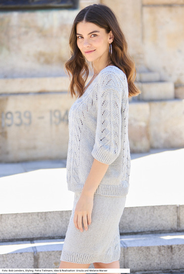 Bei diesem Set stehen Ajourmuster im wahrsten Sinne des Wortes im Mittelpunkt. Sowohl der Rock als auch der Pulli bekommen durch die Längs-Musterstreifen eine edle Note. Beidseitig des Ajourmusters wird glatt rechts gestrickt. Der V-Ausschnitt in Vorder- und Rückenteil entsteht durch eine einfache Teilung in der Mitte. Dreiviertellange Ärmel mit Armkugel passen sich perfekt ein, sodass sich eine schöne Schulterpartie ergibt. Der Rock hat einen Saum aus Rippenmuster und einen Bund im Doppelstrick. Die Anleitung für ein Garn aus Viskose, Baumwolle, Leinen und Polyamid gibt es für die Größen 36/38, 40/42 und 44/46.