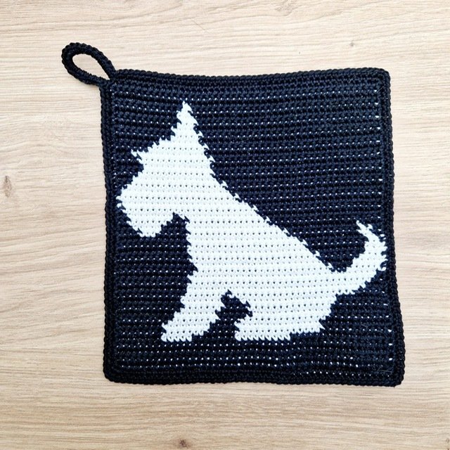 Mit der von mir verwendeten Wolle hat der Topflappen eine Größe von ca 20cm x 20cm