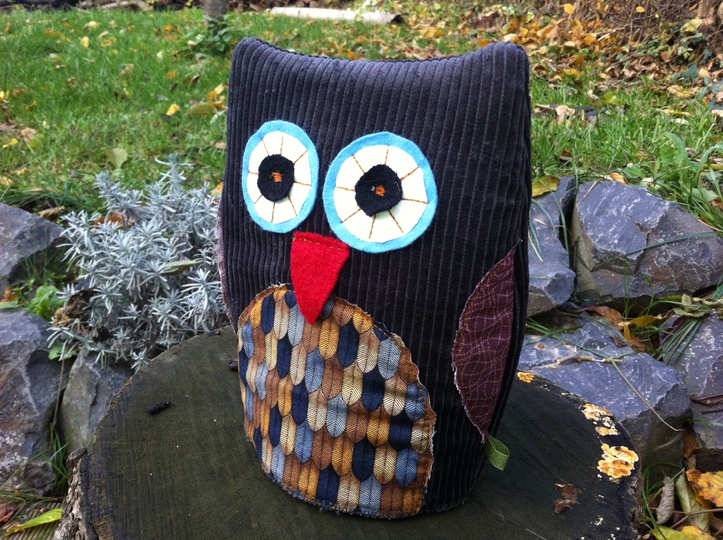 Mit Füllwatte oder Reis/Kiesel gefüllt kann die fertige Eule in verschiedenen Größen als Türstopper, Spieluhr oder Kissen benutzt werden.