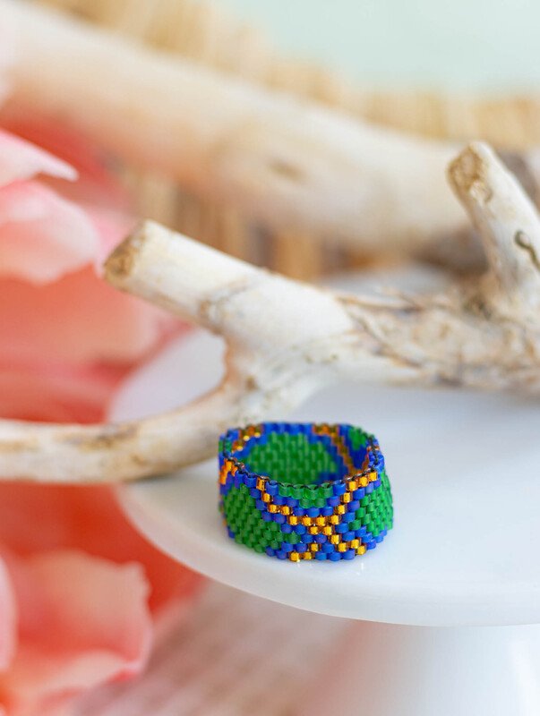 Die Größe Variiert nach Anzahl der gewebten Reihen und der verwendeten Perlenart. Im Muster sind Rehen zur Größenanpassung vorhanden, die weggelassen oder vervielfacht werden können um unterschiedliche Ringgrößen mit nahtlos schließendem Muster herzustellen.