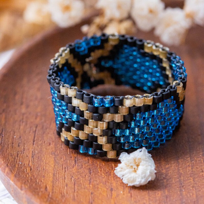 Für verschiedene Ringgrößen enthält das Muster zusätzliche Reihen, damit das Schlangenmuster ohne Unterbrechung angepasst werden kann. Zur Umsetzung benötigst du Grundkenntnisse aus der Basisanleitung „Perlenweben in der Peyote-Technik mit gerader Perlenzahl“, die du ebenfalls in meinem Shop findest.