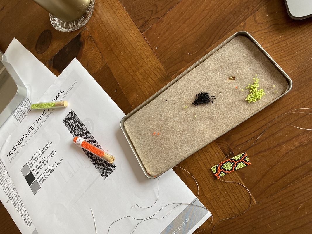 Das Perlenweben in Peyote-Technik kommt ohne Webrahmen aus – du brauchst nur Perlen, Nadel und Faden.