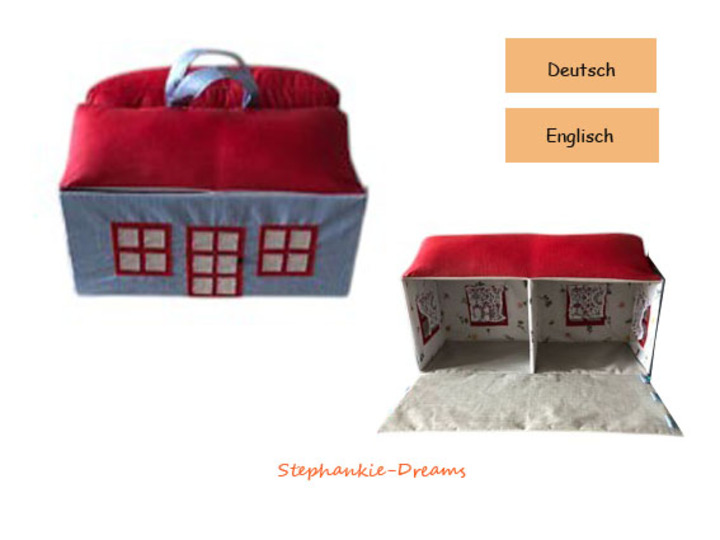 mit Hartschaumplatten verstärkt. Und damit es Wasserabweisend ist, werden zum nähen beschichtete Baumwolle oder dünnes Wachstuch benutzt. Damit man es bei bedarf einfach mal abwischen kann. Das Haus hat zusammengeklappt eine Länge von 46cm, eine Breite von 33cm und eine Höhe von 23cm.