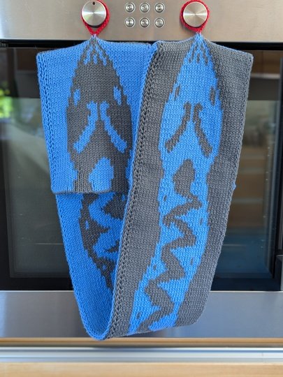 Mit einer Maschenprobe von 20 Maschen x 30 Reihen = 10 x 10 cm hat der Ofenhandschuh eine Größe von ca. 17,5 x 88 cm.