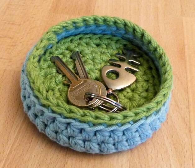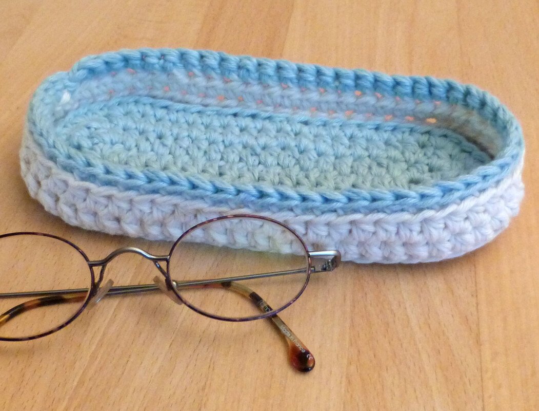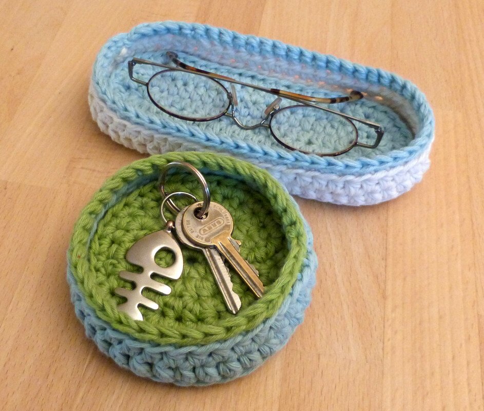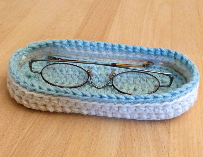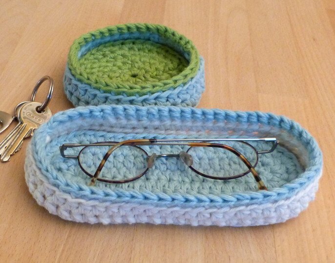 Bei Verwendung von Baumwollgarn mit einer Lauflänge von ca. 85m/50g mit doppeltem Faden und Nadelstärke 5 wird die längliche Schale ca. 18 cm lang und passt z.B. für handelsübliche Brillen. Das runde Schälchen bekommt einen Durchmesser von ca. 11 cm.