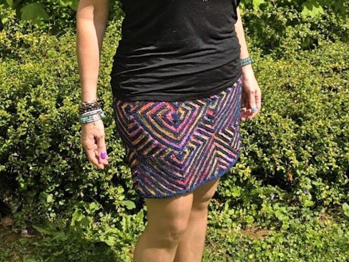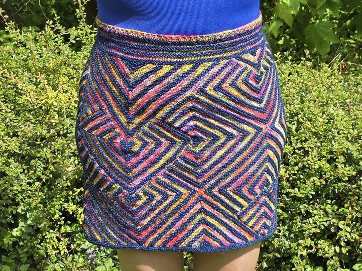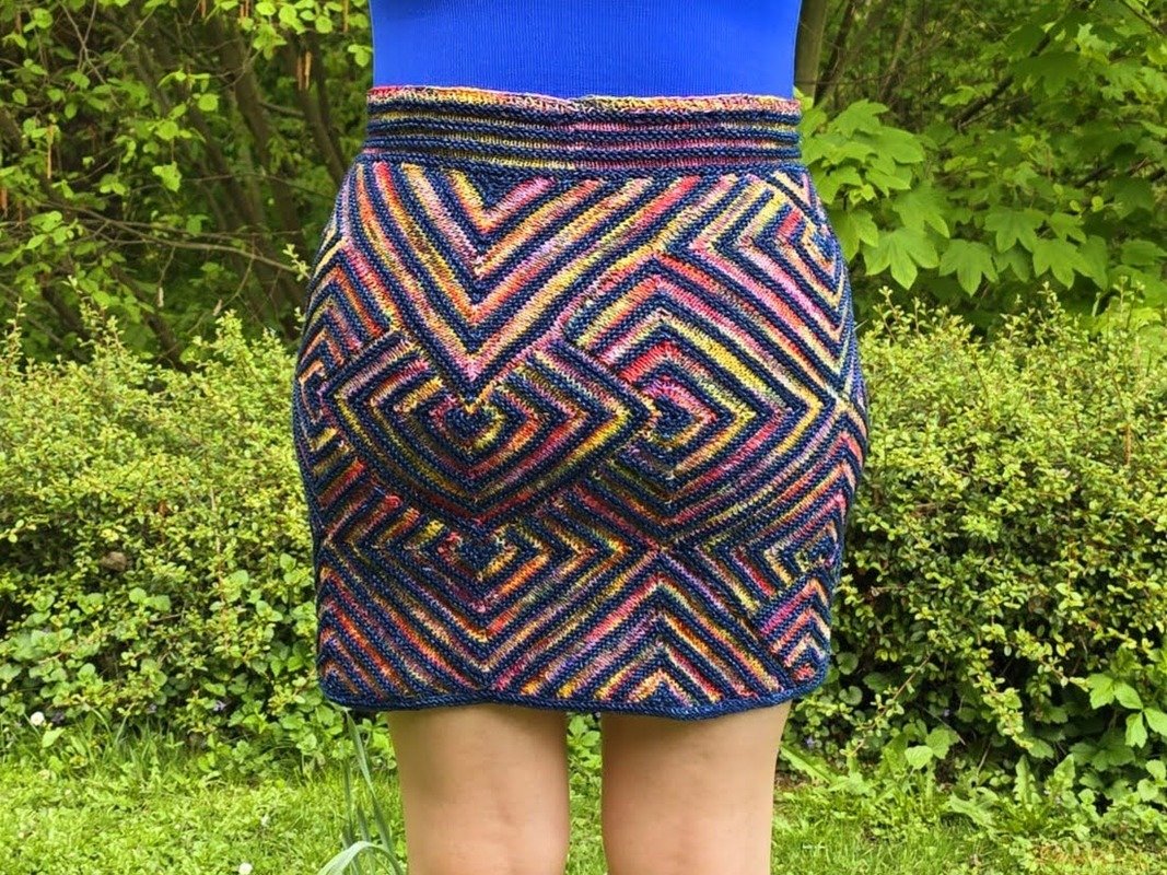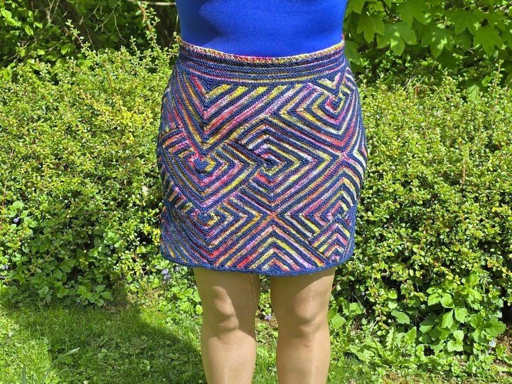 Karla ist ein raffinierter Rock in Patchworktechnik gearbeitet. Die einzelnen Patches werden alle direkt aneinander gestrickt, d.h. es gibt keine Naht und wird an einem Stück gestrickt. In der Anleitung werden zwei Längenvarianten gezeigt und auf diese weise kann der Rock auch problemlos um weitere Patchreihen verlängert werden.