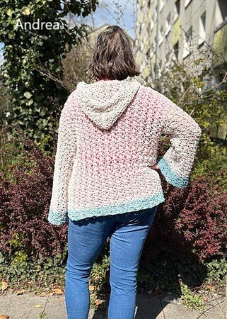 Mit seiner lockeren Passform, der gemütlichen Kapuze und den schönen Details macht er einfach Spaß – beim Häkeln und beim Tragen. Und das Beste: Du kannst ihn ganz individuell in deiner Lieblingsfarbe gestalten. Ob luftiges Baumwollgarn für den Sommer oder ein kuscheliges Mischgarn für kühle Abende – du bestimmst den Look!