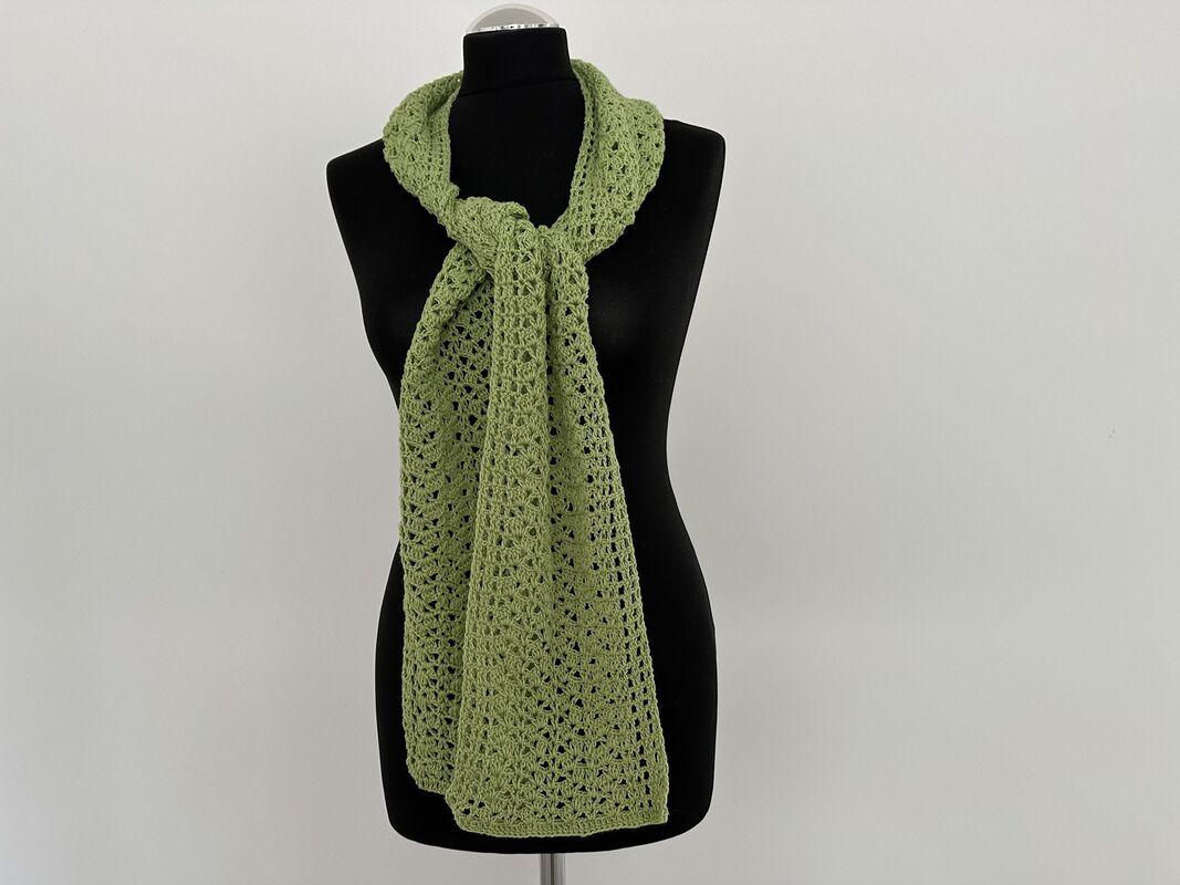 Unter Verwendung des angegebenen Materials wird der Sommerschal ca. 160 cm lang und ca. 16 cm breit.