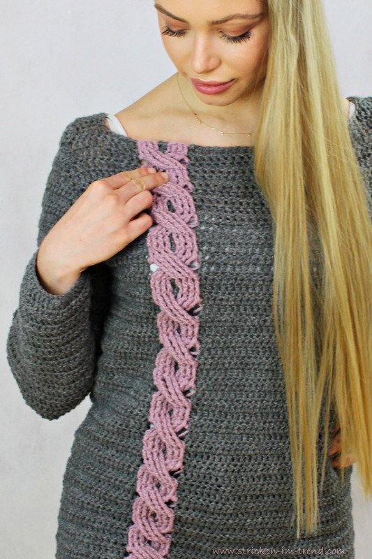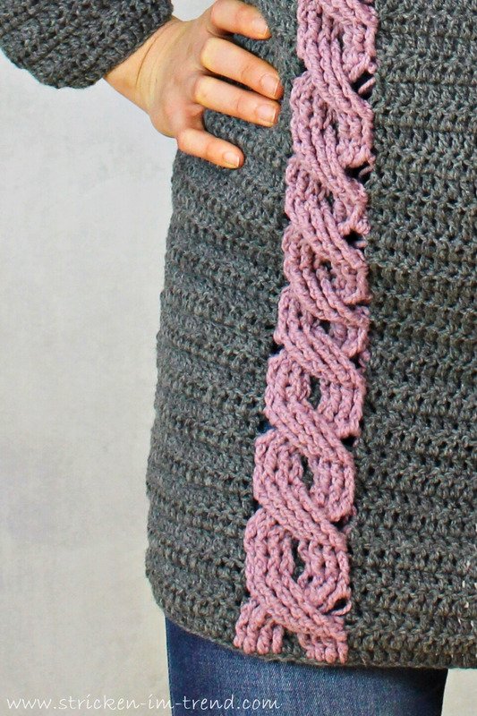 Schlicht im Schnitt, besonders im Detail – der auffällige Häkelzopf in Kontrastfarbe macht aus einem Basic ein echtes Statement-Stück.